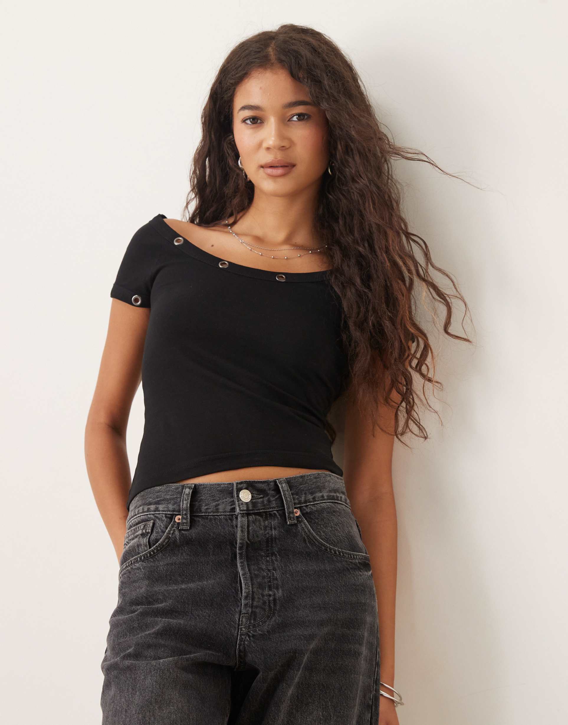ASOS DESIGN WIDE NECK RIB SHORT SLEEVE TOP WITH STUD DETAIL IN BLACK