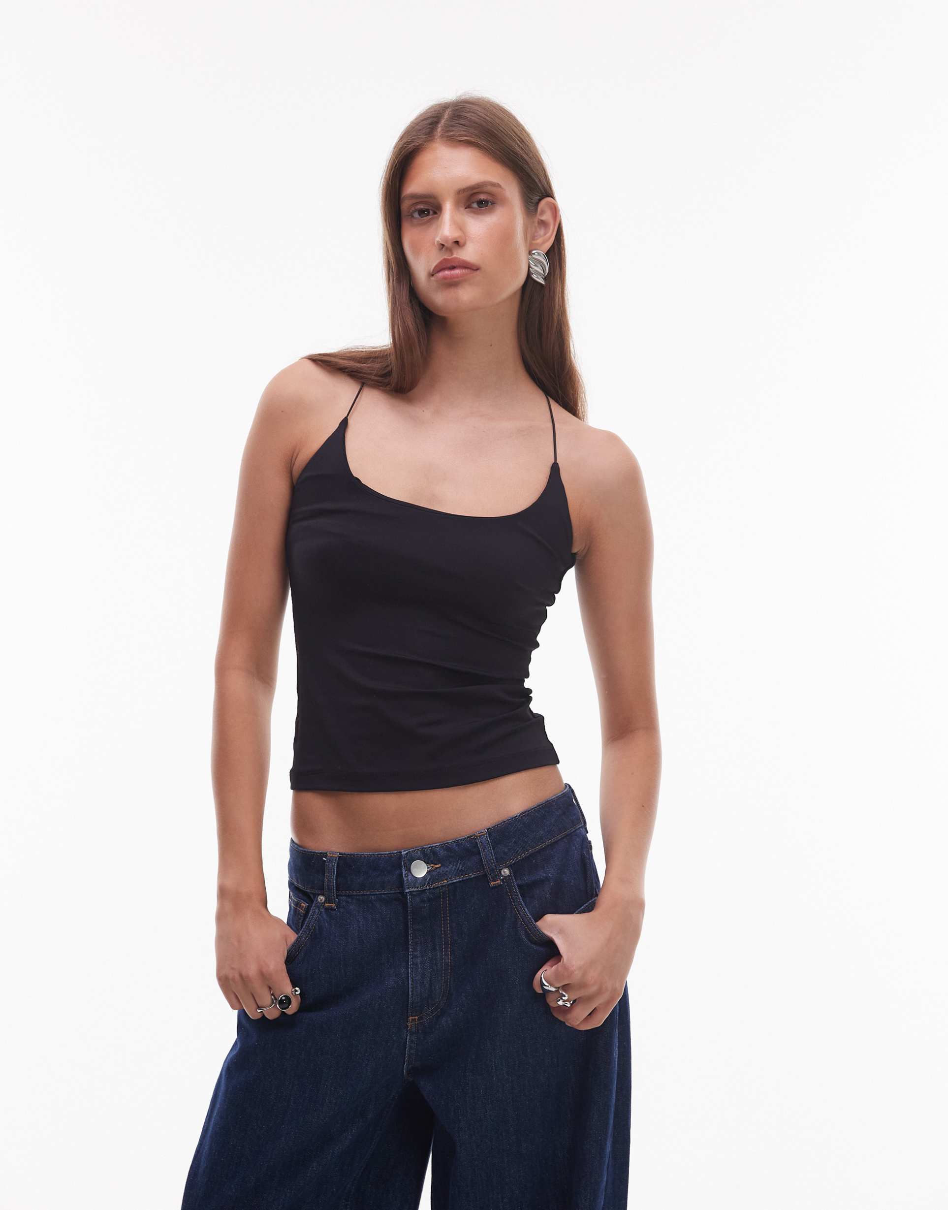 Soft and stretchy jersey fabric shapes this slim fit tank top featuring a wide scoop neck and delicate spaghetti straps that cross at the back for a minimalist yet stylish look. Its waist length and sleeveless design make it ideal for warm weather, perfect for casual outings, streetwear vibes, or everyday layering. The solid black color enhances its versatility and pairs effortlessly with denim or tailored trousers, making it a chic essential for spring and summer wardrobes.