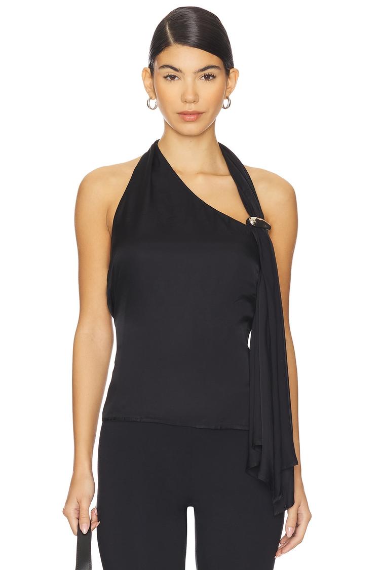 Soft matte black viscose creates a sleek, elegant tank top with a halter neckline and strapless sleeveless design. The relaxed fit gently drapes at the front, accentuated by a stylish buckle detail and a hidden side closure with hook and eye for a smooth silhouette. Its open back adds a modern, chic touch, making this hip-length top perfect for warm spring and summer evenings. Ideal for casual outings, date nights, or night outs, it pairs effortlessly with tailored pants or skirts for versatile, sophisticated looks.