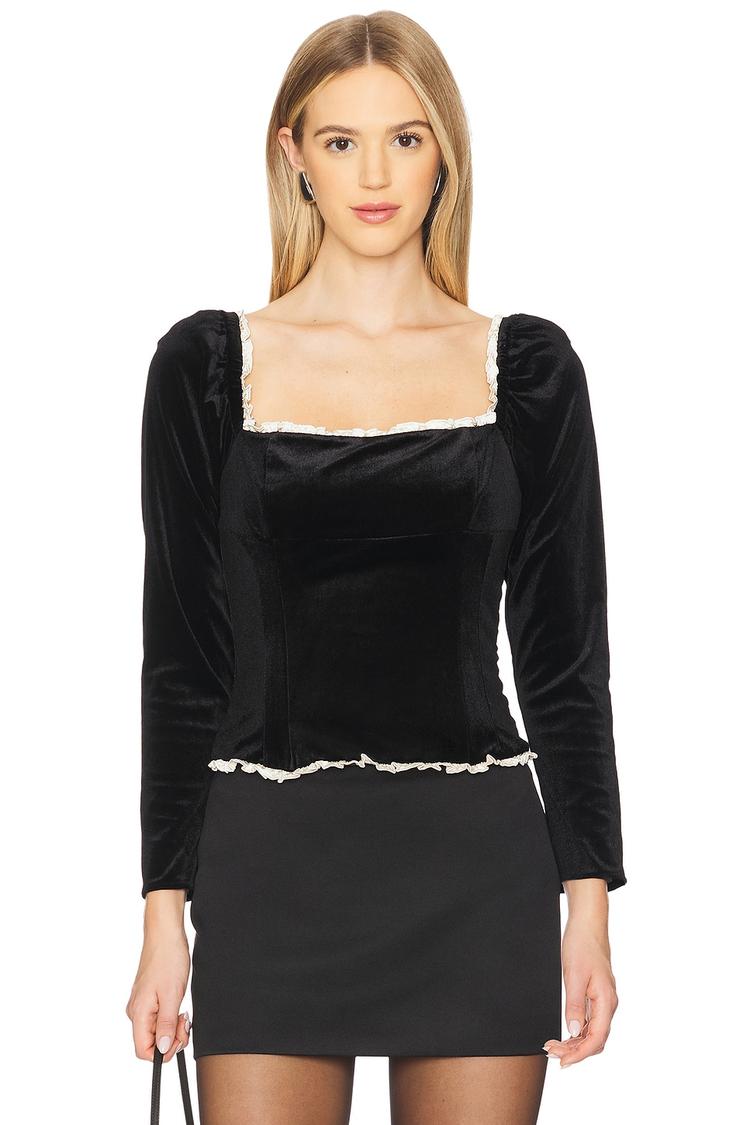 Soft velvet fabric defines this fitted corset top featuring a flattering square neckline and long regular sleeves. The waist-length silhouette is enhanced with delicate off-white satin lettuce trim ruffles along the neckline and hem, while the back lace-up tie-back closure adds a romantic, adjustable detail. Perfect for autumn and winter evenings, this chic and sexy top is ideal for casual outings, date nights, or girls' night events. The hidden side zipper ensures a sleek finish, blending comfort with sophisticated style.