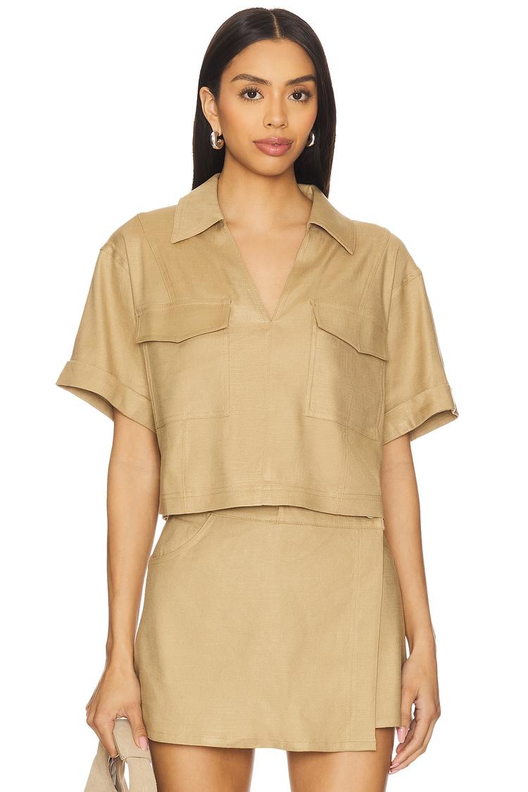 Effortlessly chic, this cropped shell top in a matte beige combines a relaxed fit with midweight twill fabric for breathable comfort. Featuring half sleeves and a classic notch lapel collar, it is styled with breast flap pockets that add subtle utility. Its pullover design enhances ease of wear, making it an ideal pick for casual outings, brunch dates, and everyday wear during spring, summer, or autumn. This minimalist piece embodies timeless sophistication with a modern edge for versatile styling.