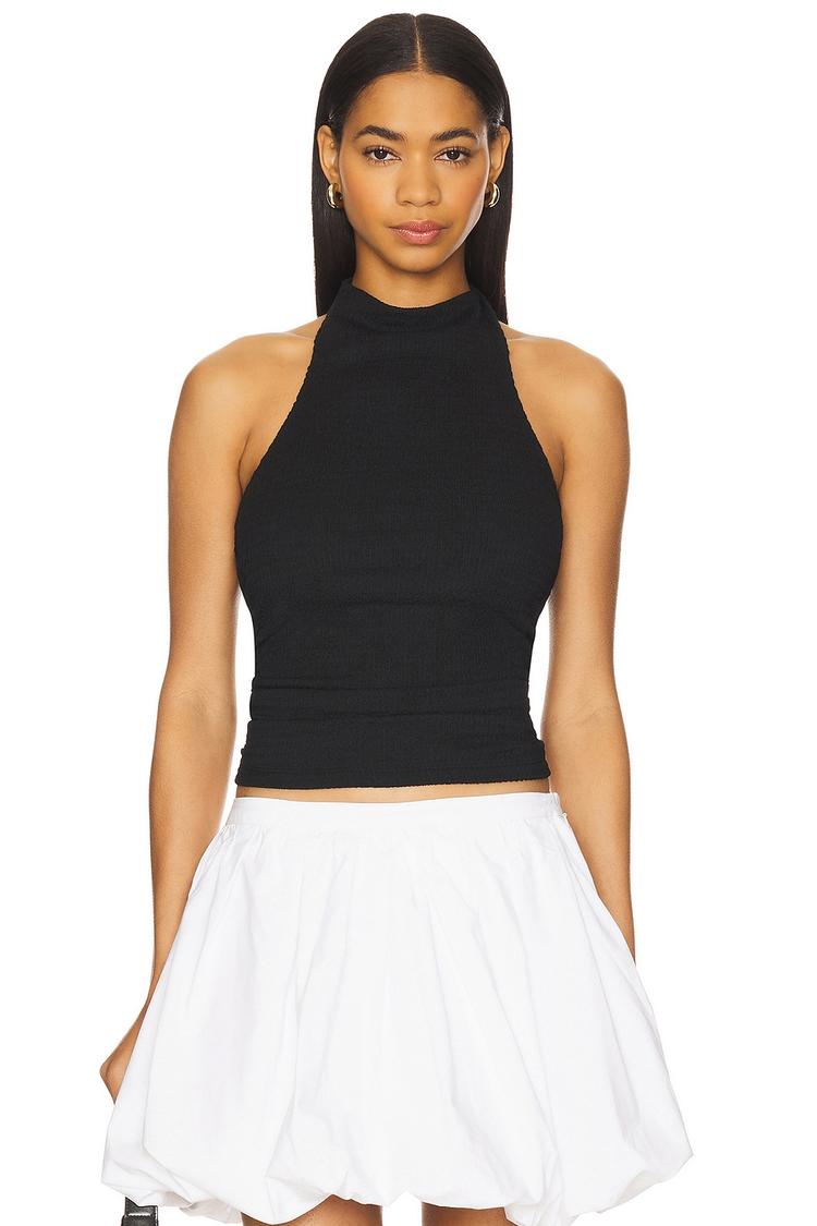 Sleek and modern, the Gwyneth Top features a fitted cropped silhouette crafted from midweight textured jersey fabric blending polyester and elastane for comfort and stretch. Its halter neck and strapless sleeve styling create a chic, minimalist look with an elegant tie-back closure adding subtle detail. Perfect for warm spring and summer days, this top is versatile enough for casual outings, brunch dates, or night outs. The solid matte black hue enhances its timeless appeal, making it a must-have staple that pairs effortlessly with skirts or high-waisted bottoms.