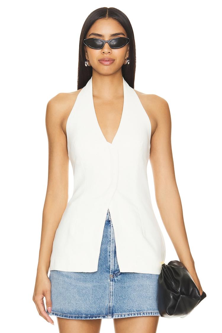 Clean lines and a crisp white crepe fabric define this chic halter neck tank top. The fitted silhouette with front button closure offers a polished yet effortless look, perfect for spring and summer days. Its sleeveless, strapless styling and hip-length cut make it an ideal choice for casual brunches, night outs, or date nights where understated elegance is key. The covered back adds to the refined aesthetic, making this versatile piece a must-have for a modern, sophisticated wardrobe.