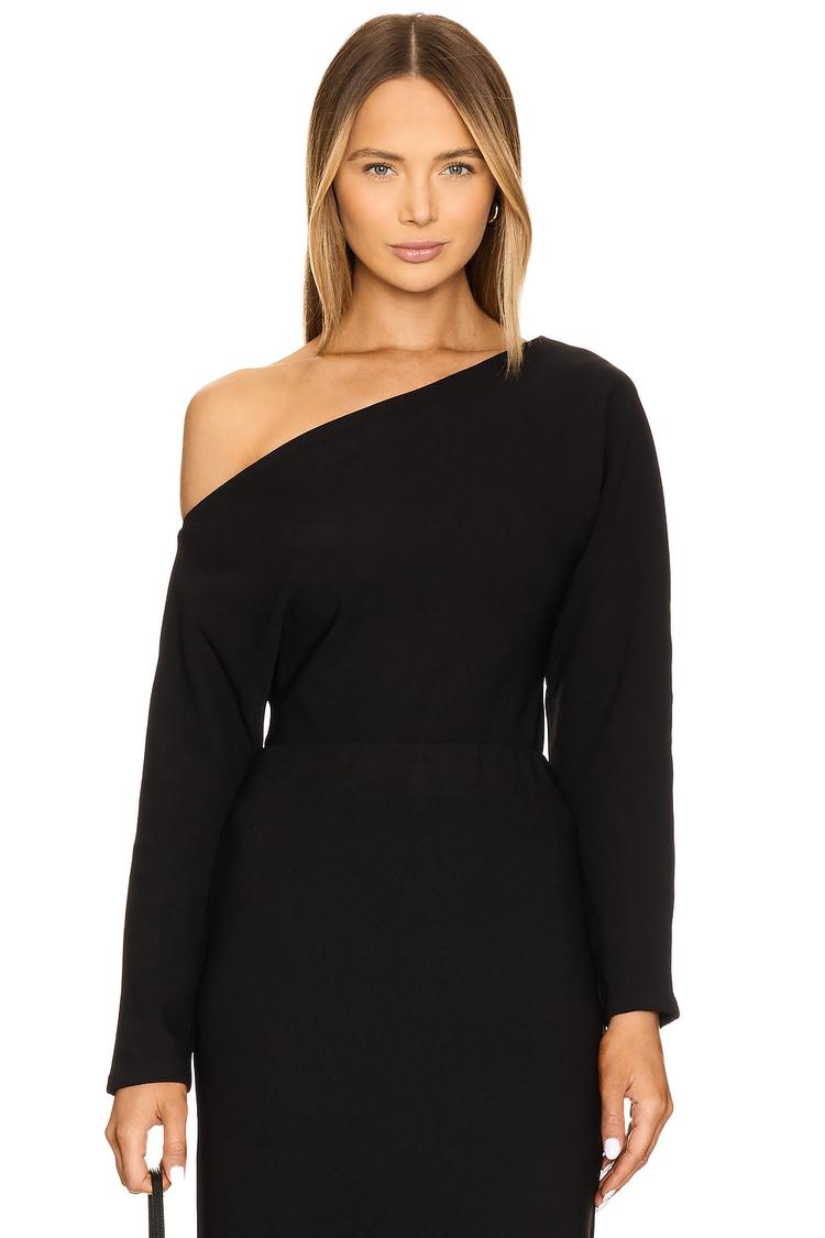 Sharp asymmetric neckline and sleek long sleeves define this slim-fit Kana Top crafted from midweight polyester crepe with a touch of elastane for stretch. Its hip-length silhouette and minimalist matte black finish offer a chic elegance perfect for casual days, workwear settings, or romantic date nights. The covered back and pullover style ensure easy wearability, making this versatile piece a refined essential in your wardrobe.