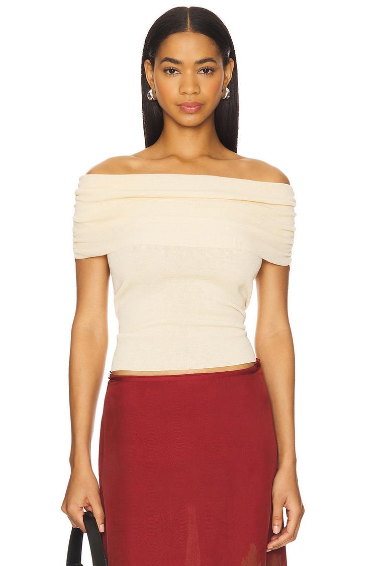 Soft drape and subtle ruching define this fitted cream shell top, crafted from a midweight knit blend of viscose, polyamide, and linen. The off-shoulder, foldover neckline and sleeveless strapless styling create an elegant silhouette at waist length, perfect for casual outings, brunch dates, or sophisticated day-to-night looks. Its minimalist chic vibe and covered back add to its versatile appeal, making it an essential piece for spring and autumn wardrobes.