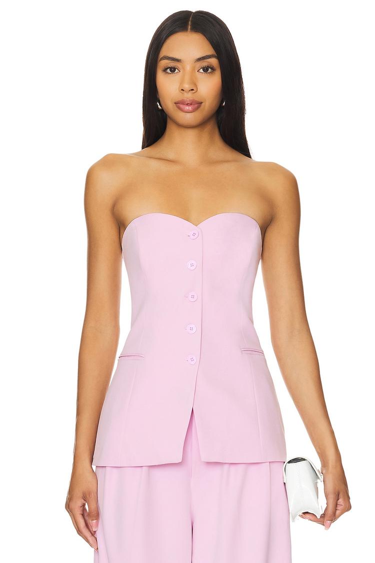 Soft light pink crepe fabric shapes this fitted corset top with a feminine sweetheart neckline and strapless design, perfect for spring through autumn wear. Featuring front button closure and welt pockets, the standout back lace-up tie detail adds a modern, chic edge. The hip-length silhouette flatters the figure while offering versatile styling options. Ideal for casual brunches, elegant night outs, or daytime events, this top blends classic corsetry with contemporary comfort, crafted from a polyester-elastane blend for a midweight feel and slight stretch.