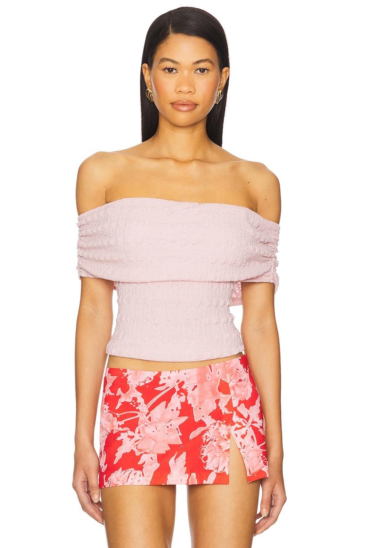 Soft pink matte textured knit fabric and a fitted silhouette come together in this off-shoulder cropped top. The fold-over neckline and all-over ruching add a chic, modern touch, perfect for spring and summer days. Its sleeveless style highlights the shoulders beautifully while maintaining a comfortable midweight feel. Ideal for casual outings, brunch with friends, or a date night, this pullover top pairs effortlessly with skirts or shorts for a stylish, feminine look.