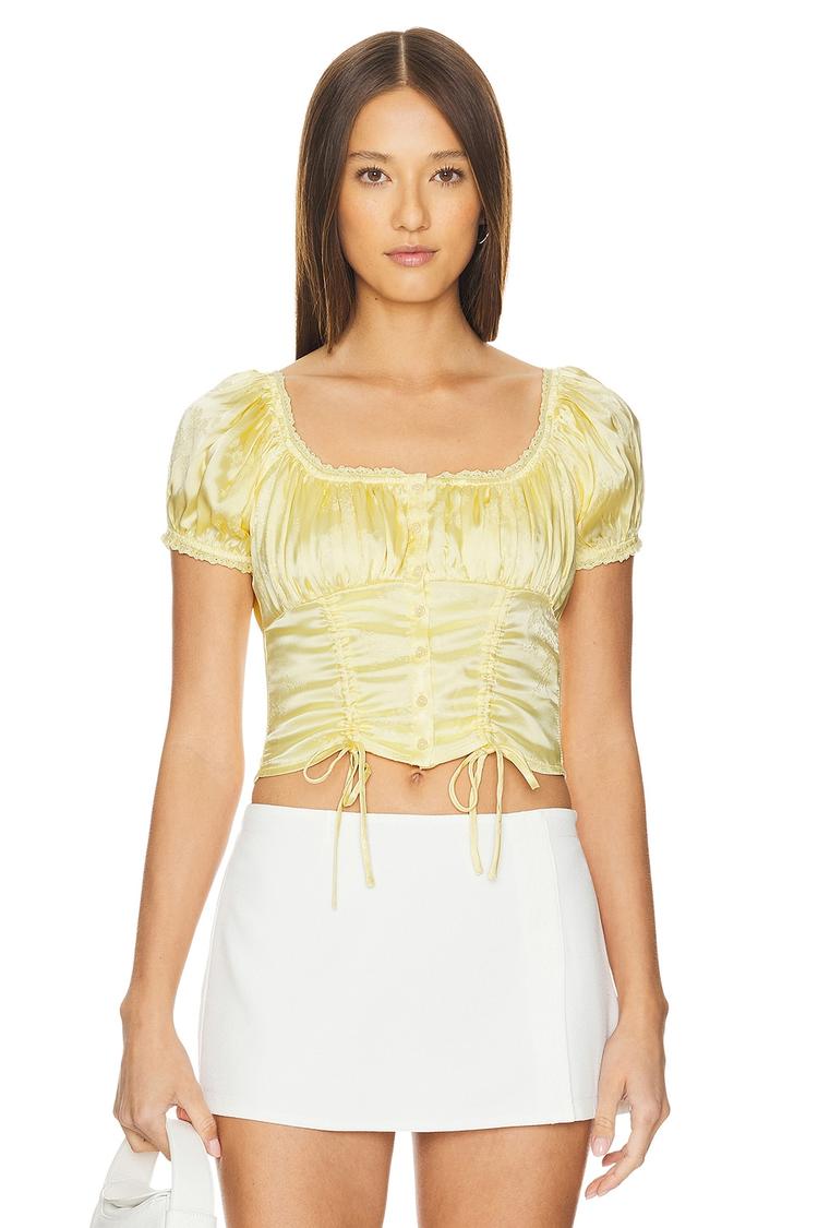 Delicate ruching and lace trim accentuate this fitted smock top in a soft light yellow satin fabric. Featuring a flattering square neckline and charming puffed half sleeves, its cropped length and smocked back provide both style and comfort. The front button closure with drawstrings adds a playful, adjustable detail. Ideal for spring and summer days, this romantic and chic piece transitions effortlessly from casual brunches to date nights, making it a versatile addition to your warm-weather wardrobe.