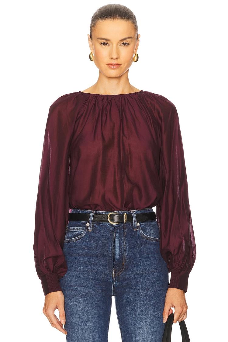Softly flowing in lightweight georgette, this elegant blouson top showcases a loose fit with long, cuffed sleeves and a delicate round neckline. The semi-sheer matte dark burgundy fabric adds sophistication, while the back button closure and elasticized cuffs provide subtle design and comfort. Perfectly suited for casual outings, business casual settings, and brunch dates, this versatile piece offers a refined yet relaxed silhouette for spring and autumn wear.