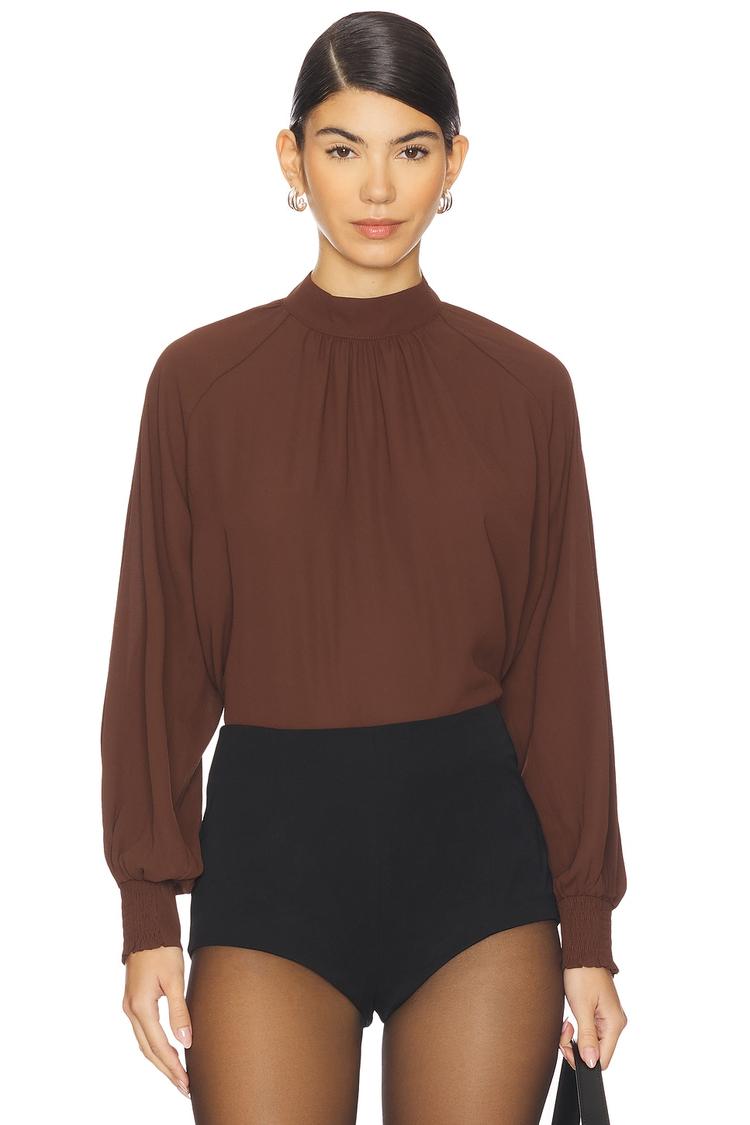 Soft matte brown polyester fabric shapes this elegant blouson top featuring a stand collar and long blouson sleeves with cuffed wrists. The loose fit and hip-length hem offer a relaxed yet sophisticated silhouette, enhanced by subtle gathers at the neckline and a keyhole back closure. Ideal for autumn and winter, it suits workwear, business casual settings, and stylish brunch outings, combining timeless classic style with modern ease and comfort.