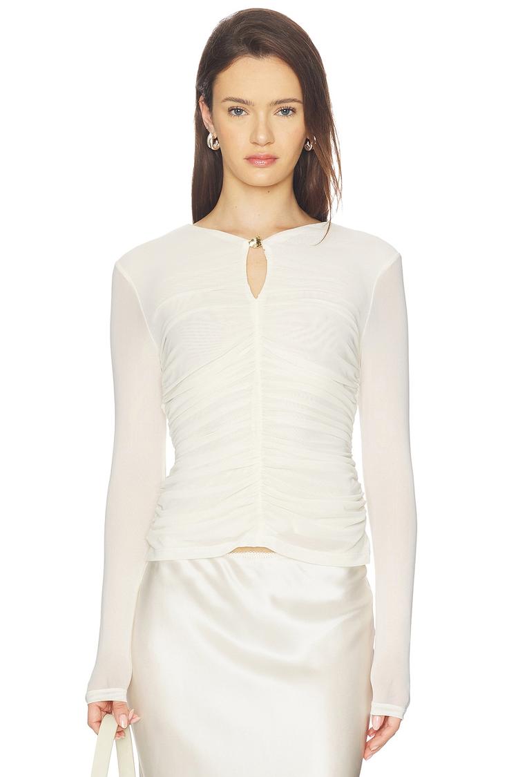 Lightweight mesh fabric and delicate ruching throughout define this slim fit shell top with a flattering keyhole neckline and long sleeves. The hip-length silhouette with a back zip closure offers a modern, minimalist appeal perfect for casual days, business casual settings, or weekend brunches. Its off-white hue and subtle texture create a chic, versatile piece that pairs effortlessly with skirts or trousers, blending comfort and style with a refined yet approachable vibe.