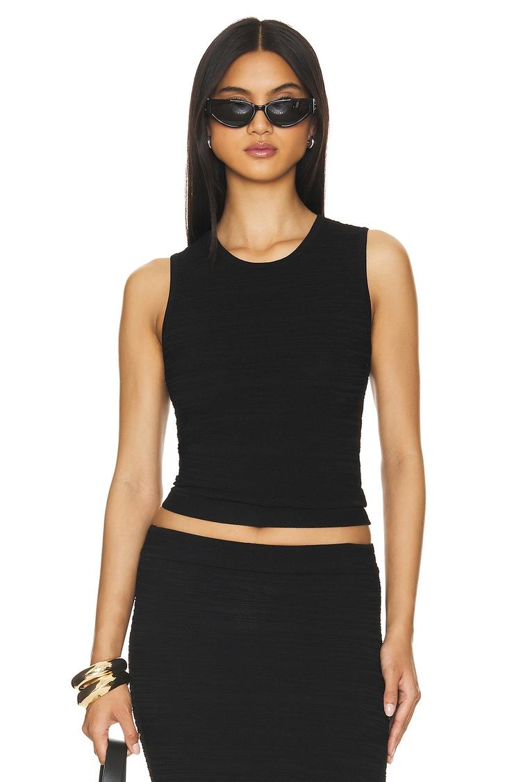 Lightweight knit fabric shapes this fitted, cropped tank with a classic crew neckline and sleeveless design. Crafted from a viscose and elastane blend, it offers a comfortable stretch and sleek silhouette. The matte black hue enhances its minimalist, casual chic appeal, making it a versatile piece for everyday wear, brunch dates, and casual outings during spring and summer. Its pullover style and covered back ensure ease of wear while maintaining a clean, streamlined look.