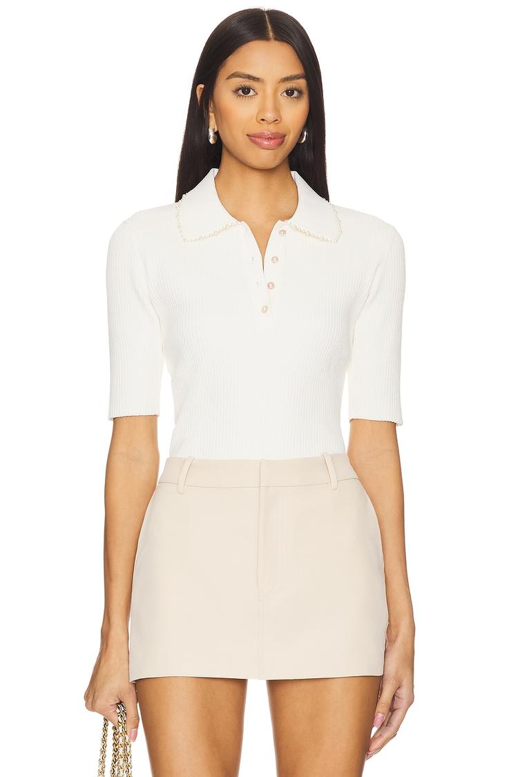 Heavyweight ribbed knit fabric and a classic polo collar accented with delicate pearl trims define this fitted polo top. Featuring half sleeves and a hip-length silhouette, its partial front button closure adds subtle sophistication. Ideal for casual outings, brunches, and workwear settings, this elegant white polo blends timeless style with refined details, crafted from a viscose-elastane blend for comfort and stretch.