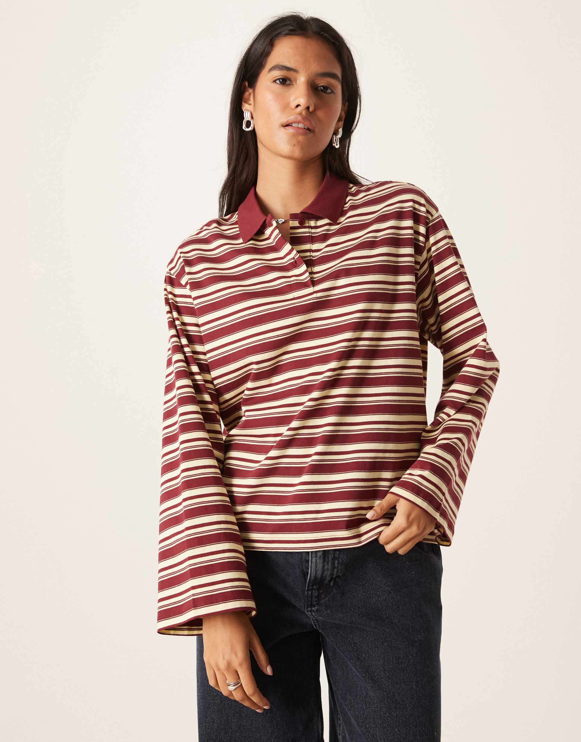 Soft, stretchy cotton jersey fabric and a relaxed fit make this striped polo top a versatile piece for your wardrobe. Featuring a classic polo collar and button placket, it offers long sleeves and a hip-length silhouette that transitions smoothly from casual outings to workwear and business casual settings. The all-over yellow and burgundy stripes create a timeless, minimalist aesthetic perfect for cooler seasons like autumn and spring. This comfortable and stylish top pairs effortlessly with jeans or trousers for an easy, polished look.