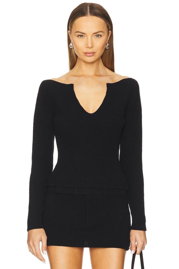 A sleek black knit tunic crafted from a comfortable cotton-nylon blend, designed with a fitted silhouette and long regular sleeves. Its deep V-neckline adds a touch of elegance while the thigh-length hemline offers modern coverage. The pull-on style ensures easy wear, making it ideal for casual outings, workwear settings, and date nights. This minimalist and chic piece balances warmth and style perfectly for autumn and winter wardrobes, making it a versatile essential for a polished and refined look.