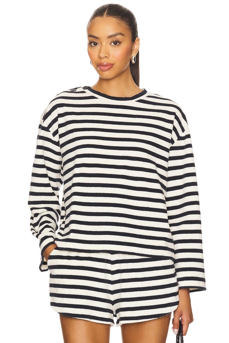 Soft midweight terrycloth cotton combines comfort and casual style in this loose-fitting swing top. Featuring classic black and white stripes all over, a timeless round neck, and relaxed long sleeves, this hip-length piece offers easy pullover wearability. Its laid-back silhouette makes it ideal for casual days, lounging at home, or everyday errands. The breathable fabric and versatile design create a chic yet effortless vibe for your wardrobe essentials.