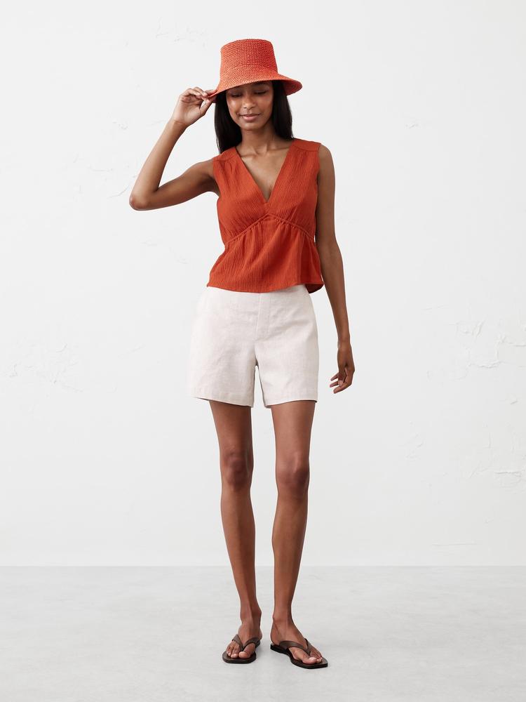Soft matte rust cotton with a relaxed fit shapes this sleeveless shell top featuring a flattering V-neckline and delicate pleated bodice details. Its waist-length cut and crinkle texture add subtle dimension, making it a perfect choice for casual days, brunch dates, or vacation getaways. The covered back and pullover style ensure easy wear and comfort during warm spring and summer months.