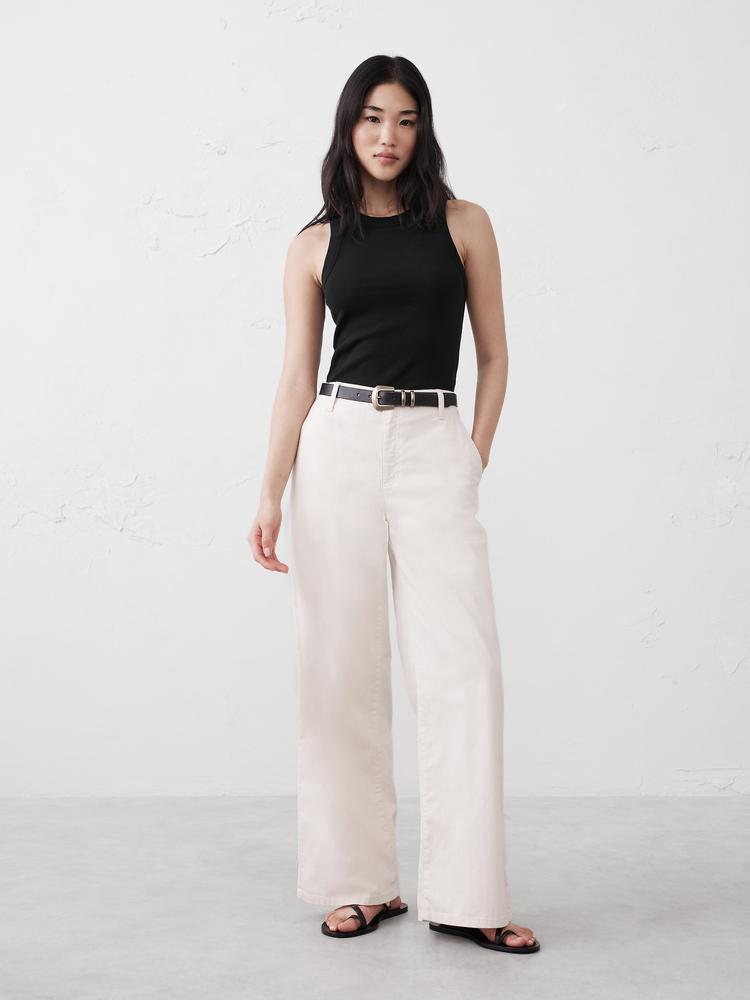 Crisp ribbed cotton and a fitted silhouette define this racer tank from Banana Republic Factory. Featuring a classic crew neck and wide straps, this sleeveless top sits at waist length for a flattering, minimalist look. Perfect for casual outings, everyday wear, or travel, it pairs effortlessly with a variety of bottoms. Its versatile black hue and clean design make it ideal for brunch dates, relaxed weekends, and layering under jackets for a casual chic vibe.