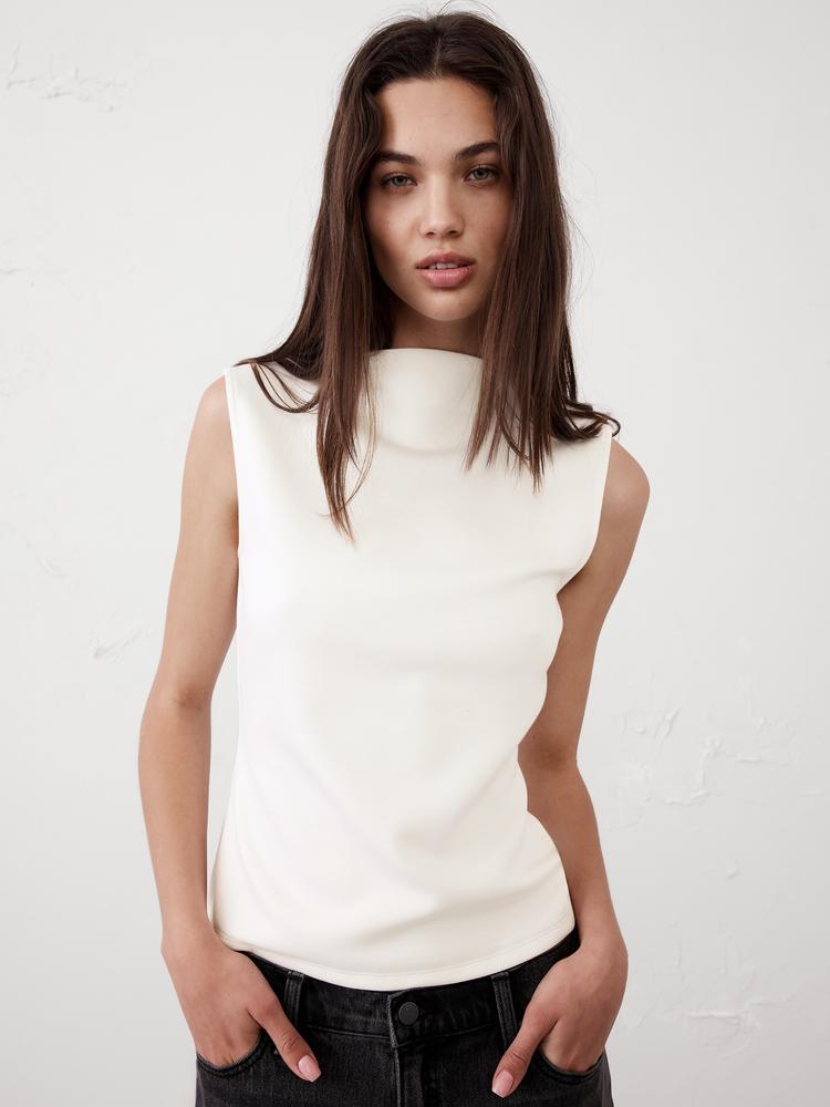 Smooth and sleek, this matte black tank features a boat neckline and a sleeveless, strapless styling for a clean silhouette. Crafted from a soft-touch scuba fabric blend of polyester and elastane, it offers a comfortable regular fit that hits at hip length. Its minimalist design makes it versatile enough for casual weekends, office settings, or business casual events, pairing effortlessly with tailored trousers or skirts. The slip-on closure adds practicality while maintaining the tank’s modern elegance.
