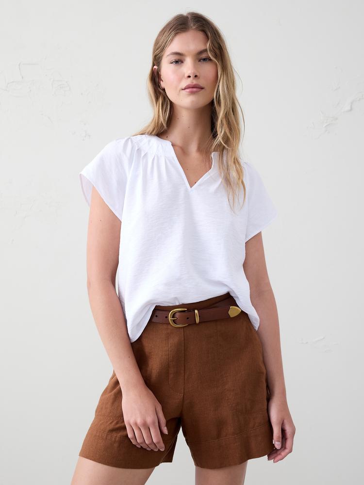 Bright green cotton with delicate stitched pleats at the neckline defines this relaxed-fit shell top. Featuring a flattering V-neck and cap sleeves, it falls to hip length for easy pairing with jeans or shorts. This versatile piece blends classic minimalism with casual and business chic appeal, making it ideal for casual outings, workwear, or weekend brunch. The lightweight cotton fabric ensures comfort across spring, summer, and autumn seasons, while the covered back and pullover style add to its effortless charm.