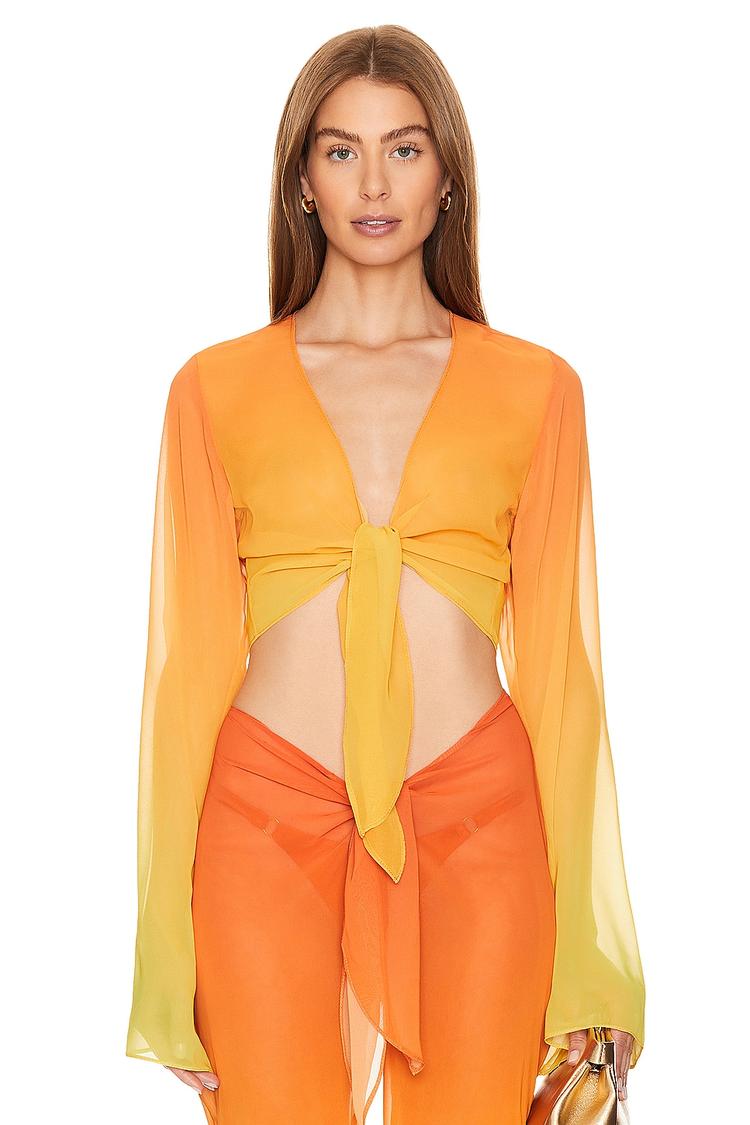 Feel the sun-drenched days in this Lily Top, a cropped wrap that's crafted in lightweight polyester chiffon. The sheer, gradient fabric shifts from a vibrant orange to radiant yellow, draping with a breezy, romantic silhouette. A front tie closure creates a flattering V-neck and a playful knot at the waist, revealing a hint of skin for a boho-chic vibe. The long, flowing sleeves add drama and movement, while the covered back keeps the look polished. Perfect for vacation, brunch, or a chic street-style moment—pair with high-waisted denim or a silky skirt for endless styling options.
