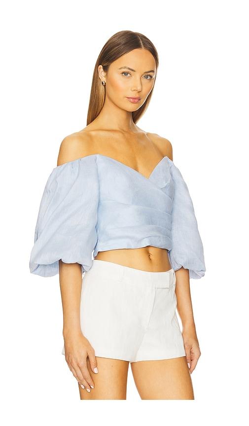 BARDOT EVA LINEN TOP IN BABY BLUE.