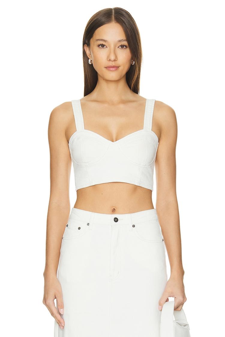 Clean lines and a crisp white hue define this cropped corset featuring a flattering sweetheart neckline and wide straps for comfortable support. Crafted from a midweight cotton-elastane denim blend, it contours the bust and offers a fitted silhouette, secured with an exposed back zipper. Perfect for warm spring and summer days, this versatile piece elevates casual outings, brunch dates, and night events with its modern, chic appeal.