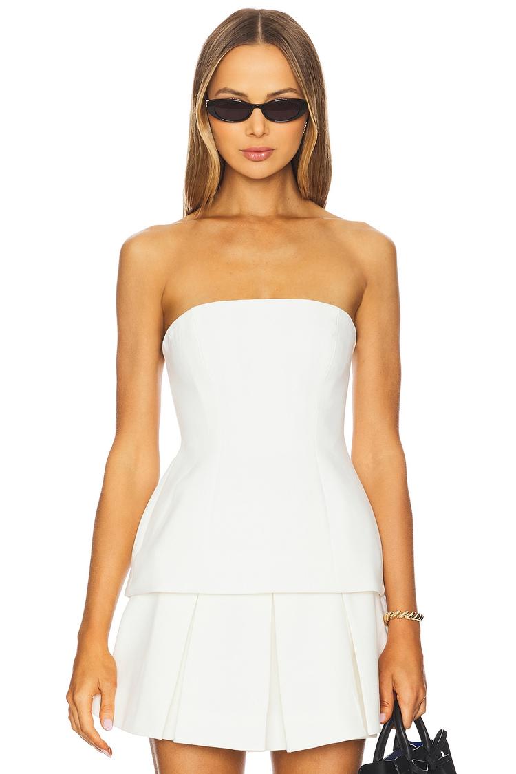 Clean lines and a crisp white hue highlight this strapless longline top crafted from midweight crepe fabric for a structured yet comfortable fit. Featuring a boned bodice with a concealed back zipper, its fitted silhouette and hip-length hem create a modern and elegant look. Ideal for spring and summer occasions, this chic piece transitions effortlessly from casual brunches to sophisticated date nights and lively evenings out. The covered back and strapless neckline emphasize a sleek, minimalist vibe with subtle design details that elevate your wardrobe staples.