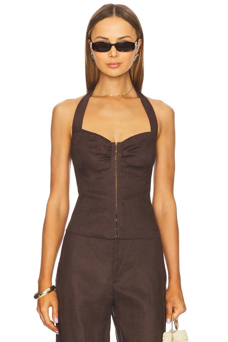 Crafted from lightweight linen with a cotton lining, this fitted corset-style halter top in a rich matte brown offers a flattering waist-length silhouette. Featuring a front hook and bar closure and a chic tie-back halterneck, it embodies classic sophistication with a modern twist. Sleeveless and perfect for warmer seasons, this versatile piece shines at casual brunches, date nights, or stylish evening outings. The solid earthy tone pairs effortlessly with various bottoms, making it an essential addition to your spring and summer wardrobe.