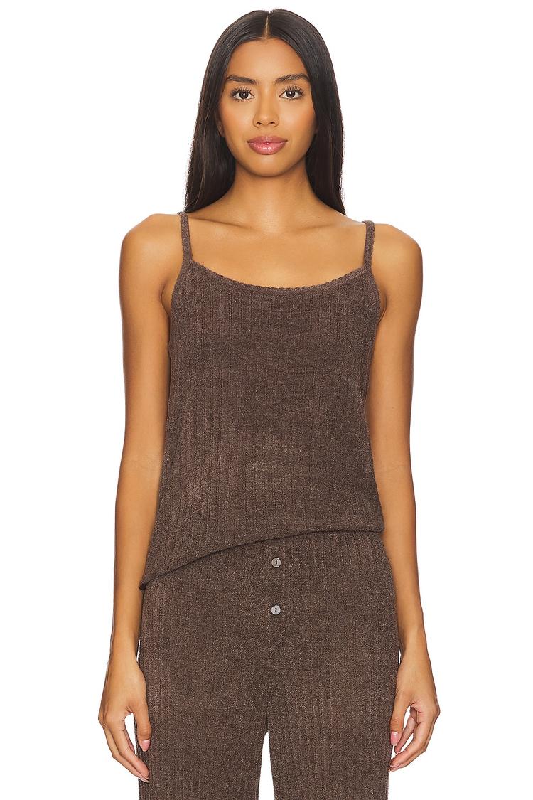 Softly ribbed and ultra-light, this brown tank top features a relaxed fit with delicate spaghetti straps and a flattering scoop neckline. Crafted from a smooth nylon-viscose blend, it offers breathable comfort for all-weather wear. Its hip-length hem and slip-on design make it a versatile layering piece, ideal for casual outings, travel days, or cozy loungewear moments. The minimalist silhouette and subtle texture lend an effortless chic vibe that transitions seamlessly from laid-back weekends to relaxed work-from-home days.