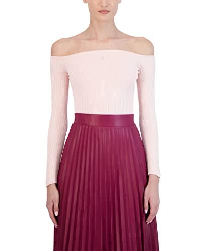 BCBGMAXAZRIA WOMEN'S FITTED RIBBED SWEATER OFF THE SHOULDER LONG SLEEVE SCULPTED NECK TOP, PINK, SMALL