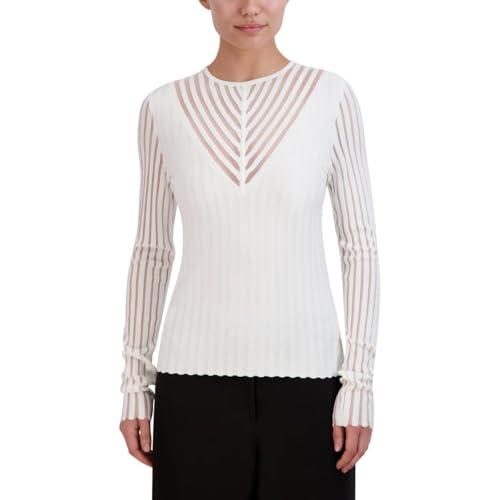 BCBGMAXAZRIA WOMEN'S PULLOVER CREW NECK SHEER STRIPE PLUNGE V SWEATER TOP, GARDENIA