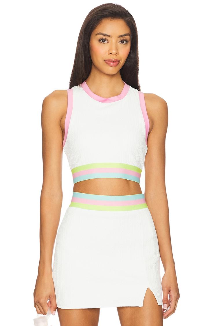 Lightweight and breathable, this cropped tank top features a sporty racerback design with ribbed trim for added texture. The close fit and pullover style made from nylon and elastane blend offer comfort and flexibility, perfect for workouts or casual athleisure looks. Accented with pastel pink and light green bands around the neckline and hem, it brings a fresh and playful vibe ideal for spring and summer days. Versatile for athleisure, workout sessions, or casual outings, this top balances style and function effortlessly.