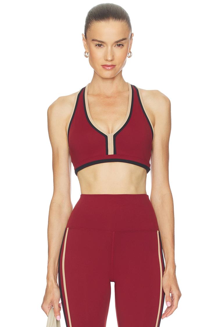 A sleek matte dark red bralette featuring a sporty racerback and wide straps for comfortable support. Crafted from a close-fitting, stretchy nylon-elastane blend, this cropped activewear top includes padded cups and a distinctive black colorblocked trim for a modern, minimalist aesthetic. Ideal for workouts, athleisure, and casual travel, it offers a midweight jersey fabric that provides durability and breathability. The pullover style ensures ease of wear, making it a versatile staple for active days and relaxed settings alike.