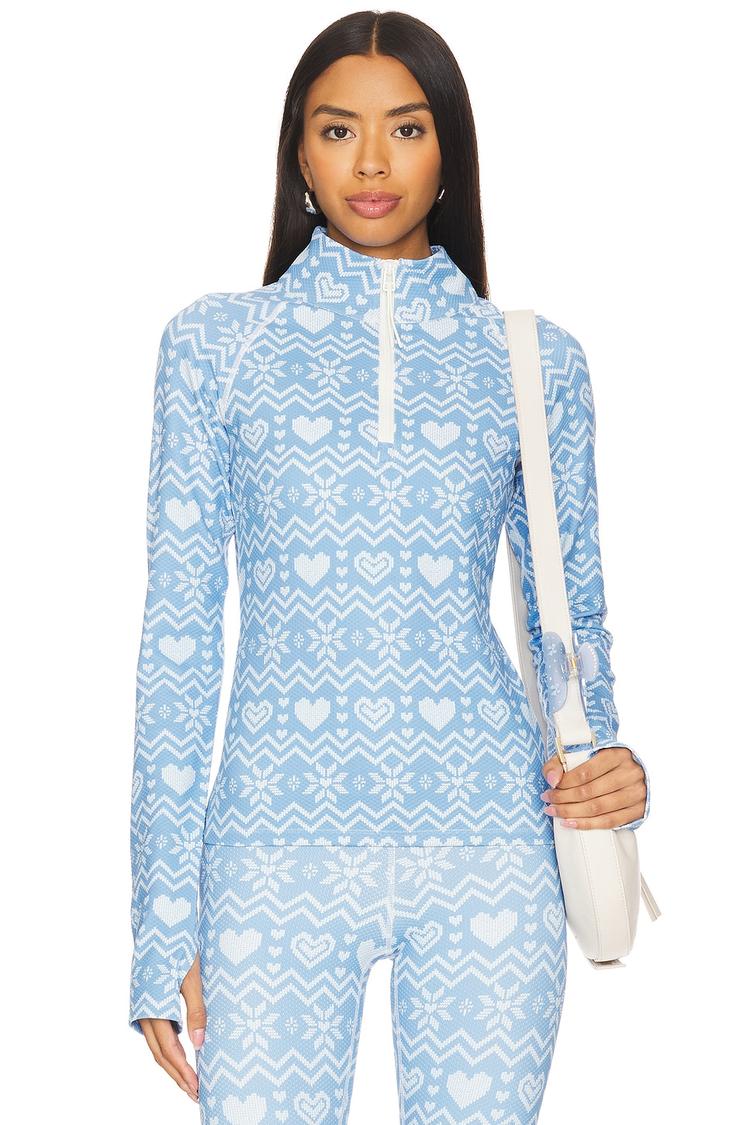 A close-fitting athletic top crafted from a stretch polyester-spandex blend showcases a light blue base adorned with an all-over white geometric and heart pattern. The hip-length silhouette features a sporty mock neck with a convenient quarter zip closure and long regular sleeves for full coverage. This modern, sporty chic piece is ideal for workouts, casual outings, or travel, offering both style and comfort with its pullover design and breathable fabric.
