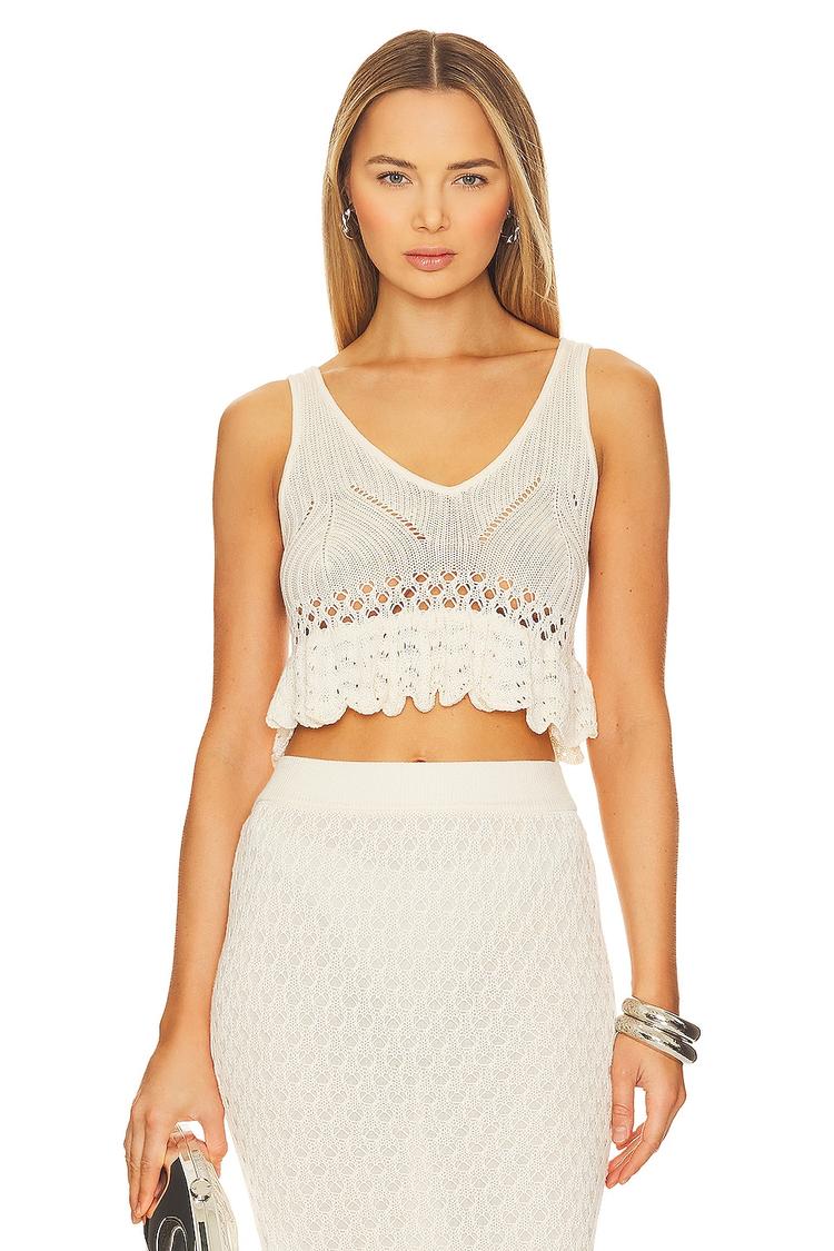 Soft viscose and open knit crochet fabric create a breezy, relaxed cropped top perfect for sunny days. Featuring a sleeveless design with wide straps and a flattering V-neckline, this off-white Leigh Top offers a casual chic bohemian vibe. The intricate crochet detailing at the hem adds texture and visual interest, making it an ideal choice for beach vacations, casual brunches, or warm spring and summer outings. Easy to slip on and pair with skirts or shorts, it delivers effortless style and comfort for a variety of laid-back occasions.