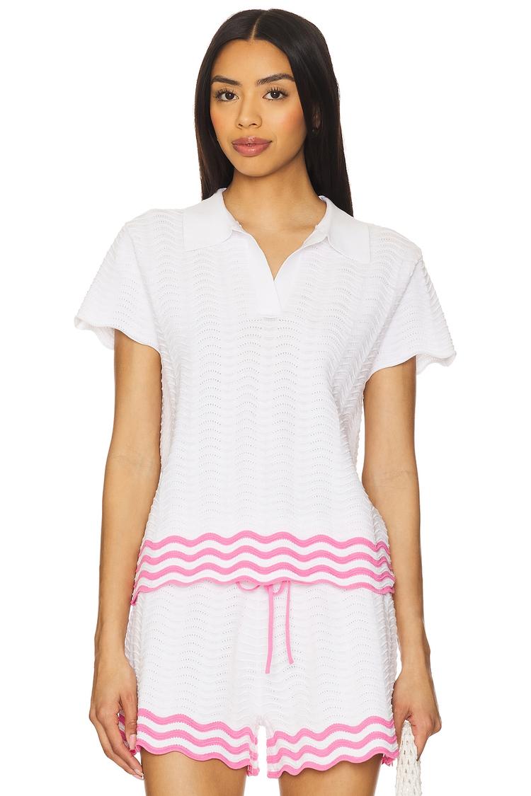 A crisp white cotton knit base accented with pink wave-striped trim delivers a fresh, relaxed vibe in this hip length tank top. The polo collar and cap sleeves create a casual chic feel, while the lightweight knit fabric ensures breathable comfort for spring and summer days. Perfectly suited for beach outings, casual vacations, or laid-back weekend wear, this pullover top brings effortless boho chic style to your warm-weather wardrobe.