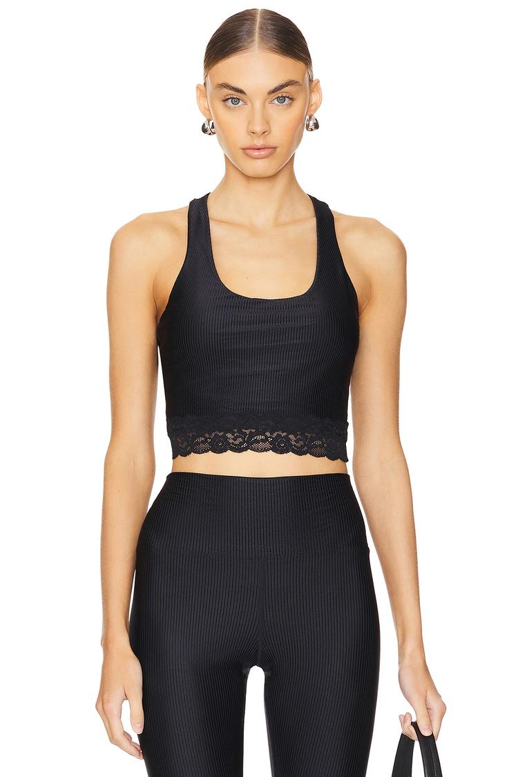 Sleek and sporty, this fitted cropped tank top features a classic scoop neck and racerback silhouette crafted from stretchy ribbed nylon and elastane jersey fabric. The matte black base color is complemented by a delicate lace trim at the hem, adding a subtle feminine touch. With detachable cup padding and wide straps for support, this versatile top is ideal for casual outings, workouts, and athleisure looks. Its breathable fabric and cropped length make it a perfect layering piece or standalone option for all-weather wear.