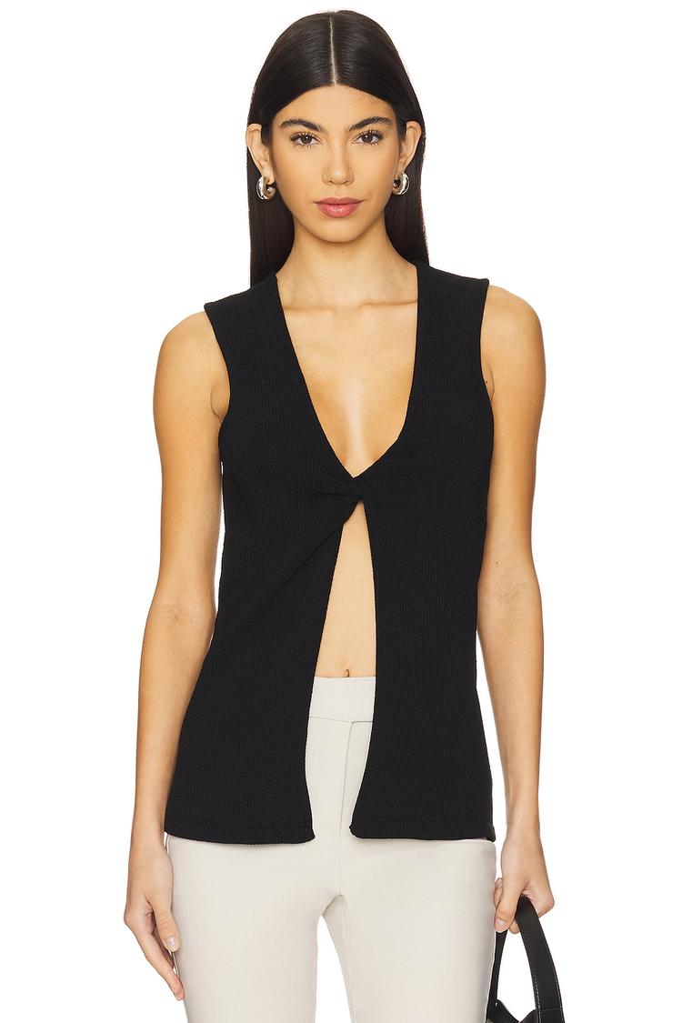A sleek black tank crafted from a heavyweight nylon-cotton knit blends comfort with style. Featuring a slim fit and hip-length cut, this sleeveless top highlights a chic V-neck with a distinctive front twist detail that adds subtle flair. The semi-sheer fabric gives a modern edge while maintaining minimalist elegance. Perfect for spring and summer, it suits casual outings, everyday wear, or brunch dates, offering versatile and effortless sophistication.