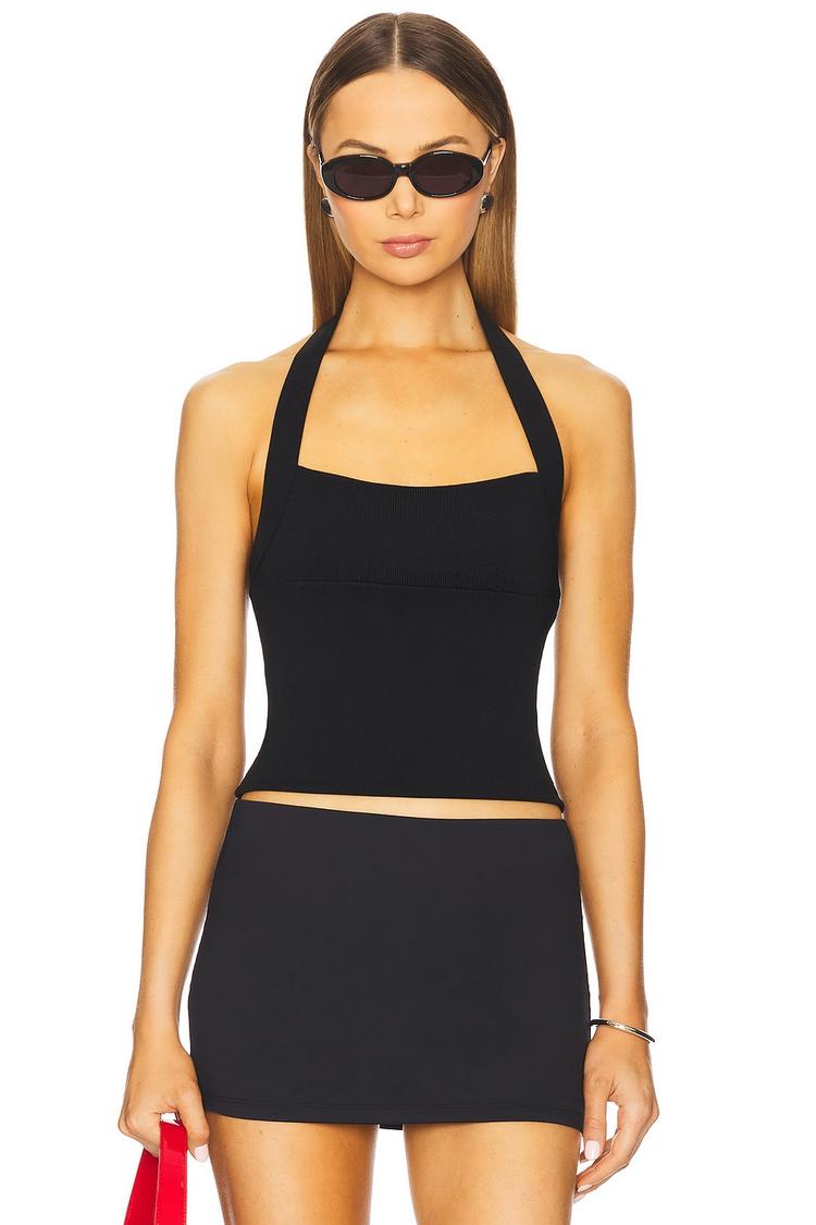 Sleek and fitted, this matte black halter neck tank top features a ribbed trim that adds subtle texture to its minimalist design. Crafted from a midweight knit blend of viscose, polyester, and elastane, it offers a comfortable stretch and a flattering cropped length that pairs perfectly with high-waisted bottoms. Ideal for spring and summer, this versatile piece suits casual outings, brunch dates, and night out occasions with ease, combining chic simplicity with effortless style.