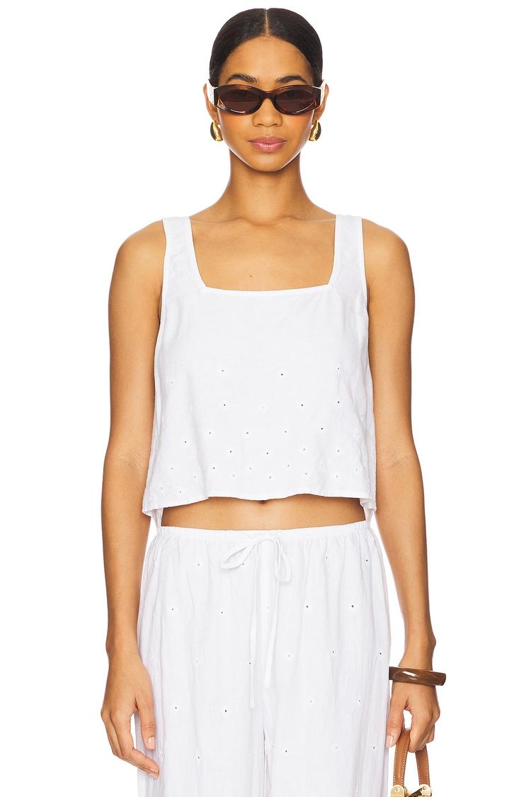 Breathable linen-rayon blend and a loose fit define this cropped tank top, designed with a flattering square neckline and wide straps for easy wear. Featuring delicate eyelet detailing all over and a chic back button closure, this summer-ready piece is perfect for casual outings, brunch with friends, or vacation days. Its minimalist silhouette combines comfort with style, making it an effortless staple for warm weather wardrobes.