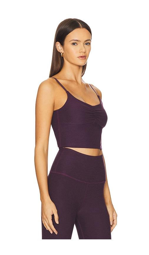 BEYOND YOGA SPACEDYE RAISED THE BARRE SHIRRED CROPPED TANK TOP IN PURPLE.