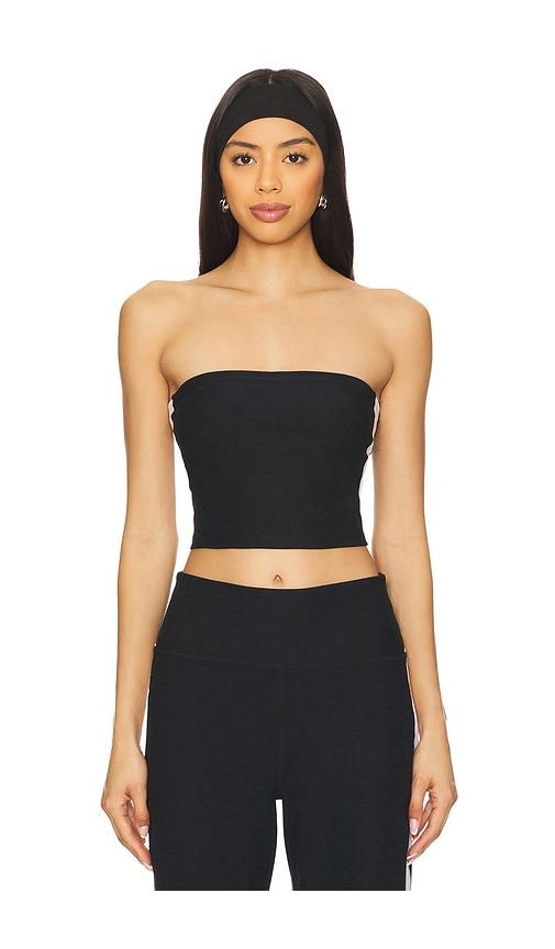 BEYOND YOGA SPACEDYE STRAPLESS STRIPE TOP IN BLACK.