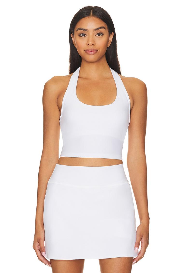 Soft jersey fabric and a built-in shelf bra define this fitted, cropped tank with a halter neck and sleeveless styling. Its minimalist white hue and sporty chic vibe make it an ideal choice for casual outings, workout sessions, and athleisure wear. The slip-on closure and clean, covered back add to its comfort and ease, while the cropped length highlights a modern silhouette perfect for warmer seasons. Crafted from a polyester-elastane blend, this tank combines stretch and softness for everyday versatility.