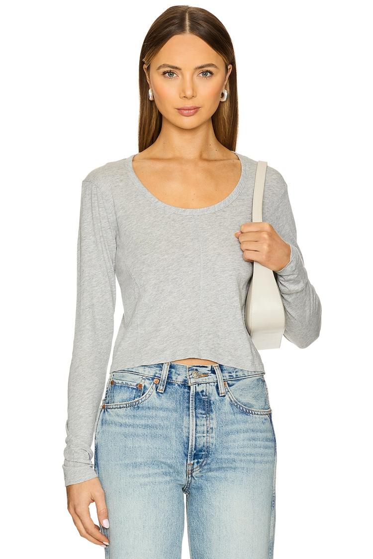Soft knit cotton shapes this cropped top with a slim fit that flatters every silhouette. Featuring a classic round neckline and long regular sleeves, it offers a minimalist and casual chic aesthetic. The solid gray tone pairs effortlessly with denim for a laid-back vibe, making it a versatile choice for everyday wear, casual outings, and weekend brunches. Its lightweight fabric and cropped length provide comfort and style throughout the year, perfect for layering or wearing solo.