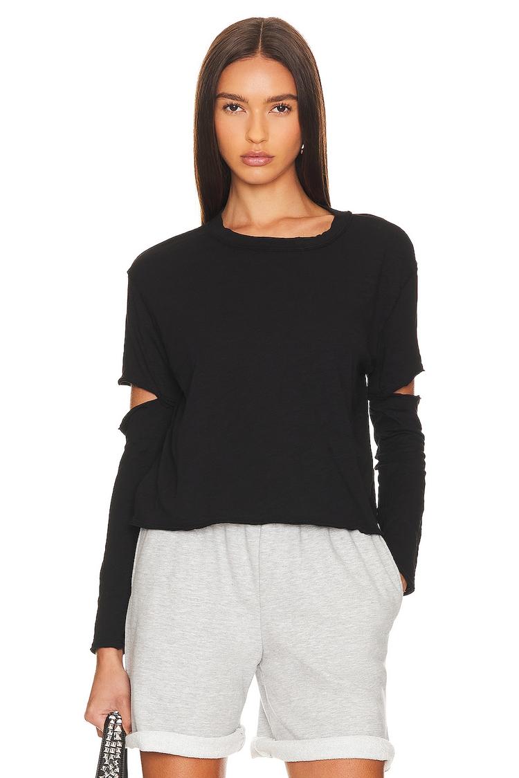 A matte black cotton top with a relaxed regular fit offers hip-length coverage and long sleeves featuring distinctive elbow cut-outs with raw-cut trim, adding subtle edge to a minimalist silhouette. The classic crew neckline complements the casual chic style, making it a versatile choice for everyday wear, streetwear, and casual outings. Crafted from breathable slub jersey fabric, this pullover top balances comfort and style for all-weather use.