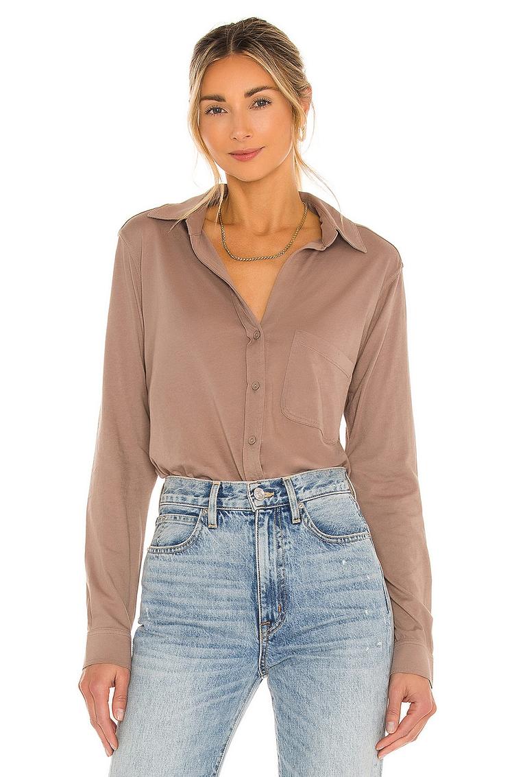 Soft matte taupe cotton jersey shapes this classic button up shirt with a relaxed fit and long sleeves featuring buttoned cuffs. The traditional collar and front button closure lend timeless charm, while the shirttail hem and breast pocket add subtle functional details. Lightweight and breathable, this hip-length shirt is ideal for casual outings, workwear, and travel days. Its minimalist aesthetic and versatile design make it easy to pair with jeans or tailored pants for effortless style across spring, autumn, and all-weather seasons.