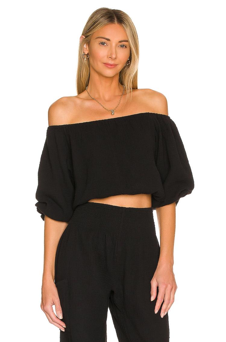 Soft cotton fabric and a relaxed fit define this off-shoulder cropped top, featuring a slightly smocked elastic neckline and hem for subtle texture. The balloon three-quarter sleeves add volume and movement, complementing the minimalist silhouette. Its versatile black hue makes it an ideal choice for casual outings, brunches, and date nights, pairing effortlessly with high-waisted bottoms. Designed for spring and summer wear, this top blends comfort with a chic, laid-back vibe perfect for warm weather wardrobes.
