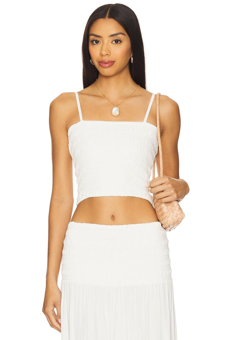 Soft and lightweight rayon crepe fabric shapes this slim-fitting tube top with an all-over smocked bodice and a straight neckline. Adjustable shoulder straps add versatility to the sleeveless cropped silhouette, perfect for warm weather. The minimalist white hue and slip-on closure make it ideal for casual days, brunches, beach vacations, or everyday wear. This effortlessly chic piece blends comfort with a subtle texture, elevating your spring and summer wardrobe with understated style.