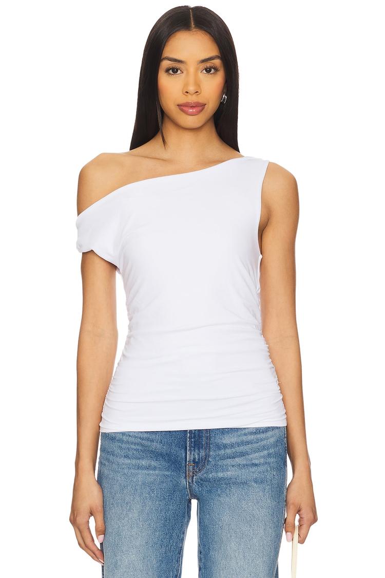 Soft, midweight draped jersey fabric shapes this fitted camisole with a chic asymmetric neckline and strapless sleeve styling. The twist off-the-shoulder design and cinched sides add elegant ruching for a flattering silhouette. Perfectly waist length, this minimalist top blends cotton, modal, and spandex for comfort and stretch. Its versatile white hue suits casual outings, brunch dates, or relaxed evenings, making it a stylish staple for spring and summer wardrobes.